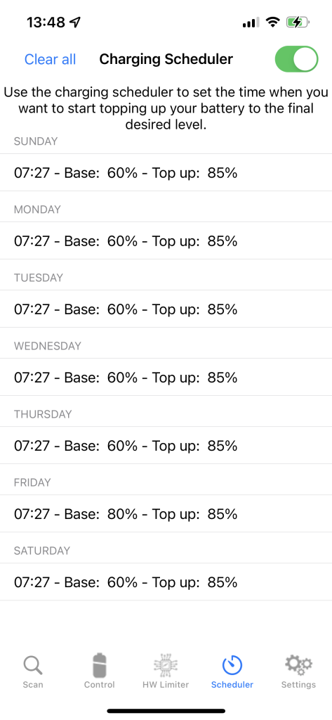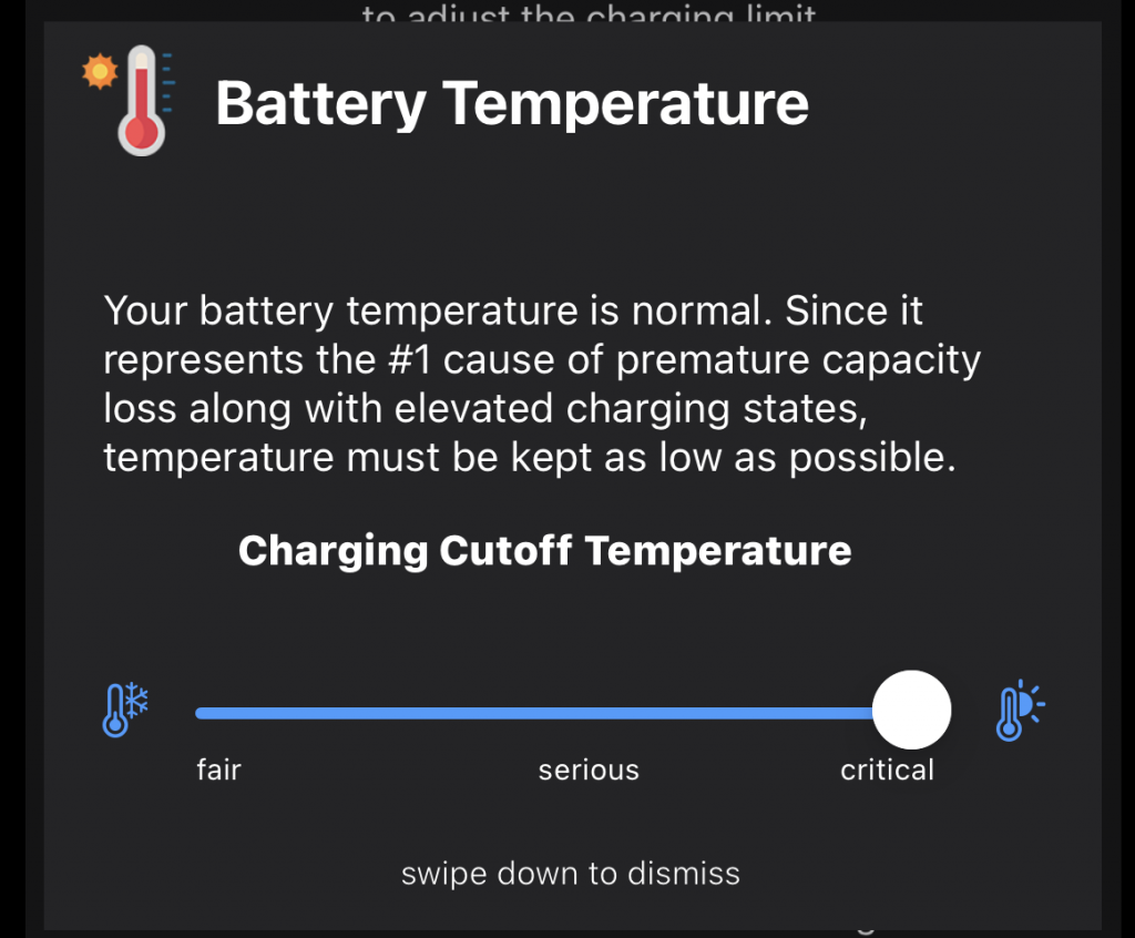 That’s why, if your environment allows (ambient temperature is not too high) you can even set the temperature cutoff threshold to “fair”. iOS already limits total power drawn from the charger by itself when the battery heats up, but this setting can go further and be even more restrictive than the default iOS settings.