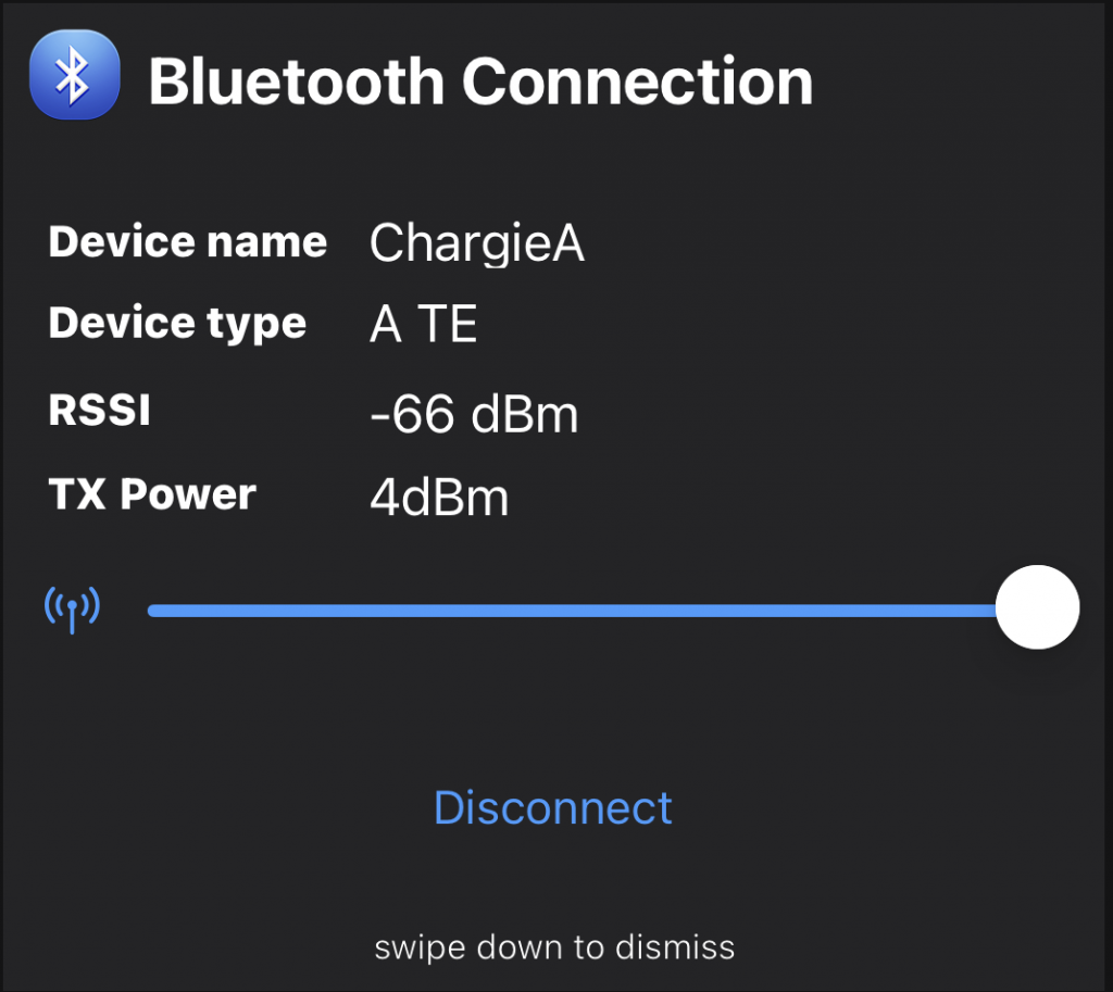 Because your device is connected via Bluetooth, you can use this screen to observe useful information about the connection or even use it to forcefully disconnect from the Chargie device.