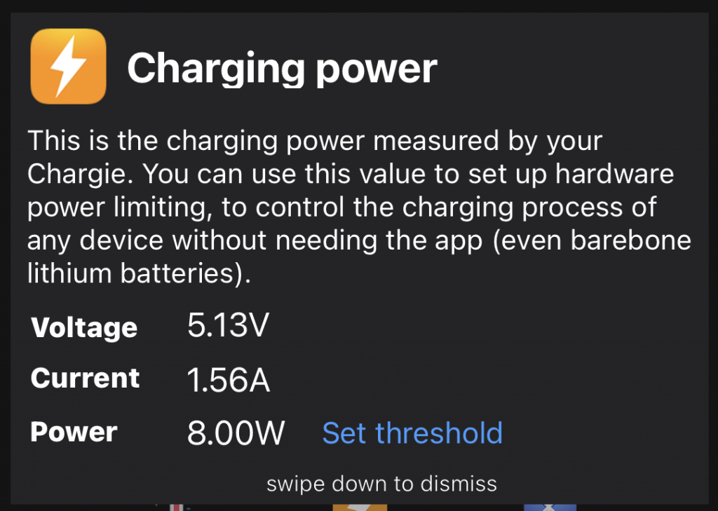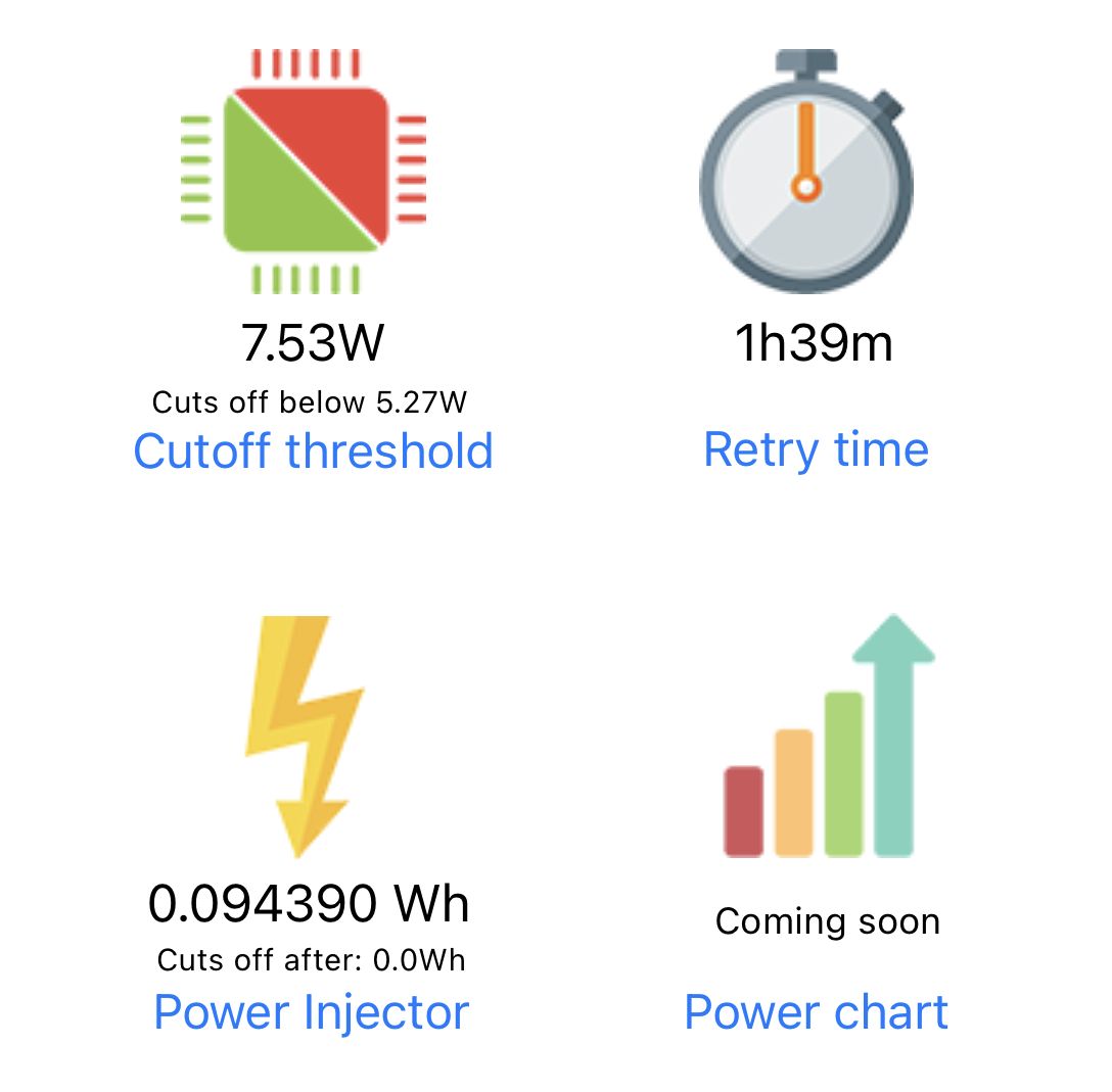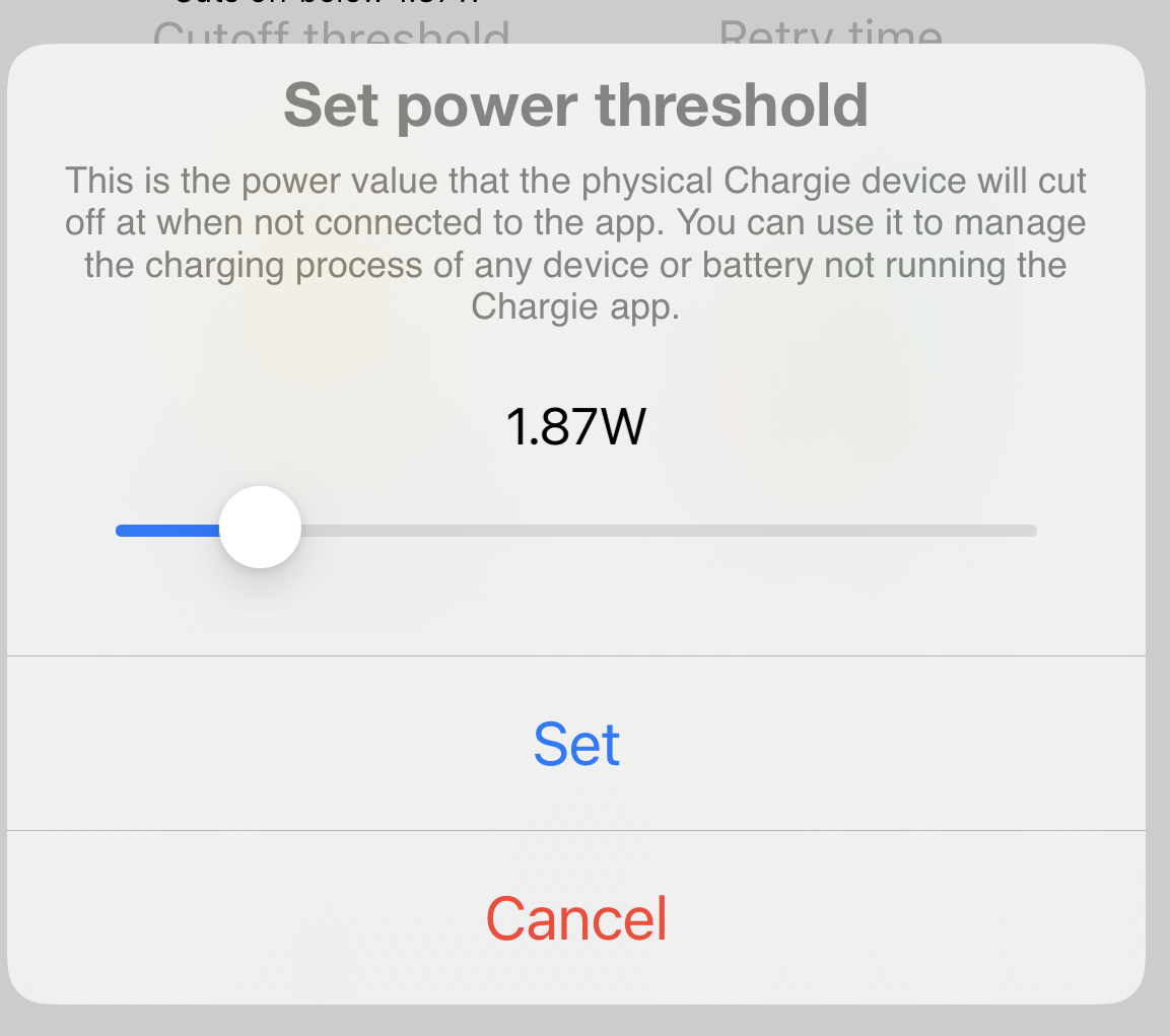 All Chargie A-series devices have current monitoring capabilities. This option is still a work in progress, but as it is in v1.1.6, you can use it to set a power cutoff threshold for your devices other than the iPhone you run this app on. For example, if you have a projector or a speaker powered by a rechargeable lithium ion battery, use the Power Limiter screen to observe and set the lowest power at which you want the device to charge at.