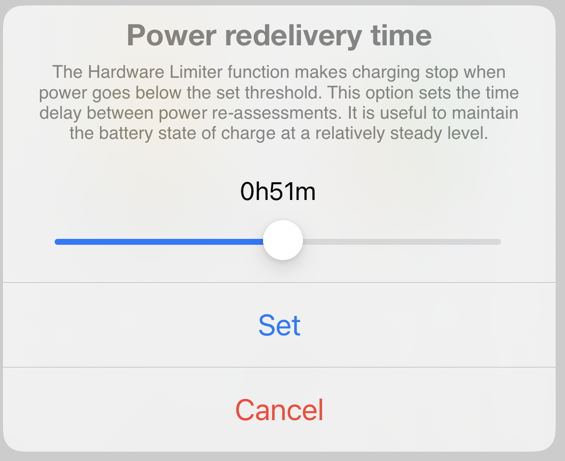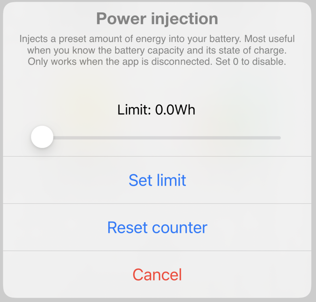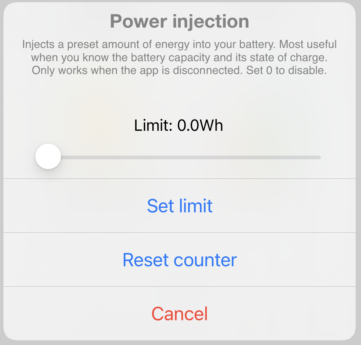 All Chargie A-series devices have current monitoring capabilities. This option is still a work in progress, but as it is in v1.1.6, you can use it to set a power cutoff threshold for your devices other than the iPhone you run this app on. For example, if you have a projector or a speaker powered by a rechargeable lithium ion battery, use the Power Limiter screen to observe and set the lowest power at which you want the device to charge at.