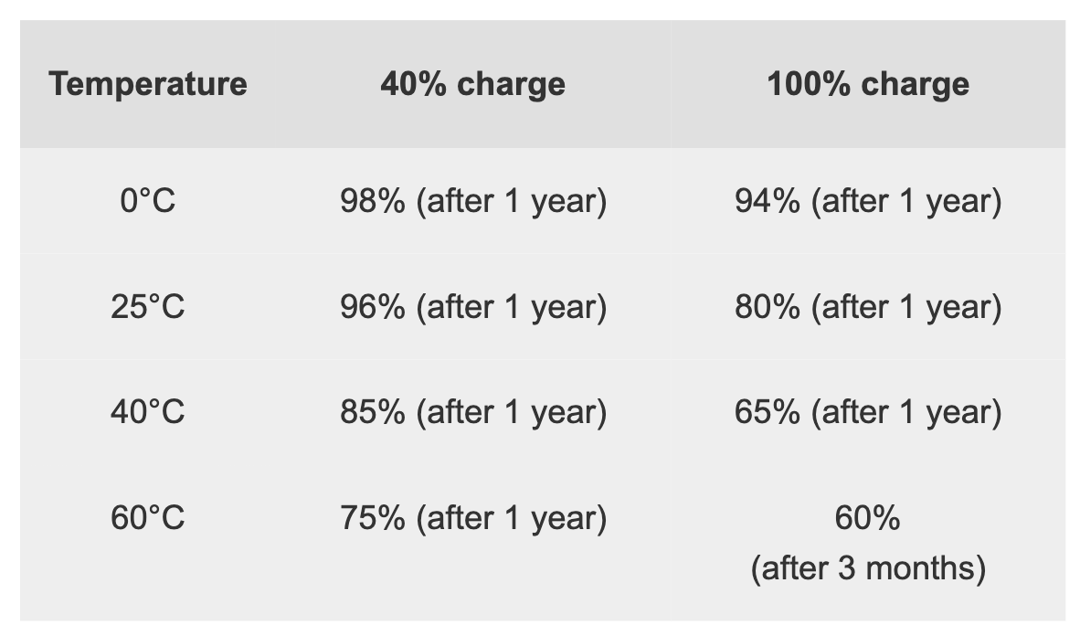 Lithium-ion suffers from stress when exposed to heat, so does keeping a cell at a high charge voltage. A battery dwelling above 30°C (86°F) is considered elevated temperature and for most Li-ion a voltage above 4.10V/cell is deemed as high voltage. Exposing the battery to high temperature and dwelling in a full state-of-charge for an extended time can be more stressful than cycling. Table 3 demonstrates capacity loss as a function of temperature and SoC.