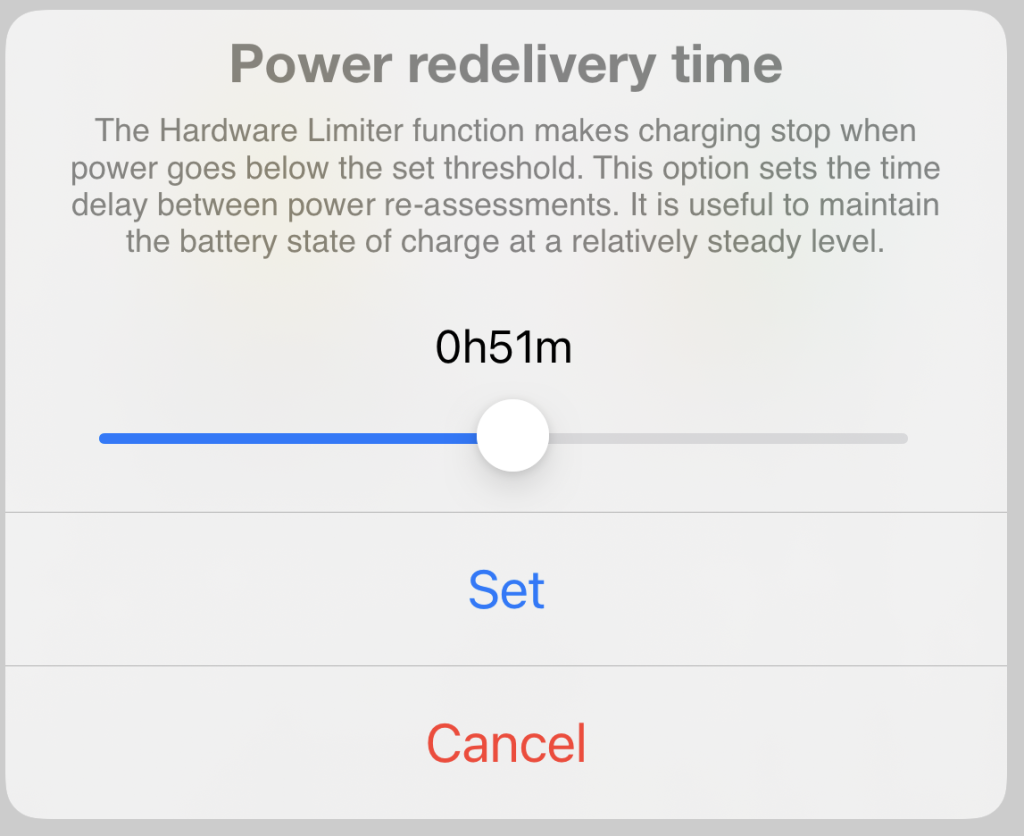 All Chargie A-series devices have current monitoring capabilities. This option is still a work in progress, but as it is in v1.1.6, you can use it to set a power cutoff threshold for your devices other than the iPhone you run this app on. For example, if you have a projector or a speaker powered by a rechargeable lithium ion battery, use the Power Limiter screen to observe and set the lowest power at which you want the device to charge at.