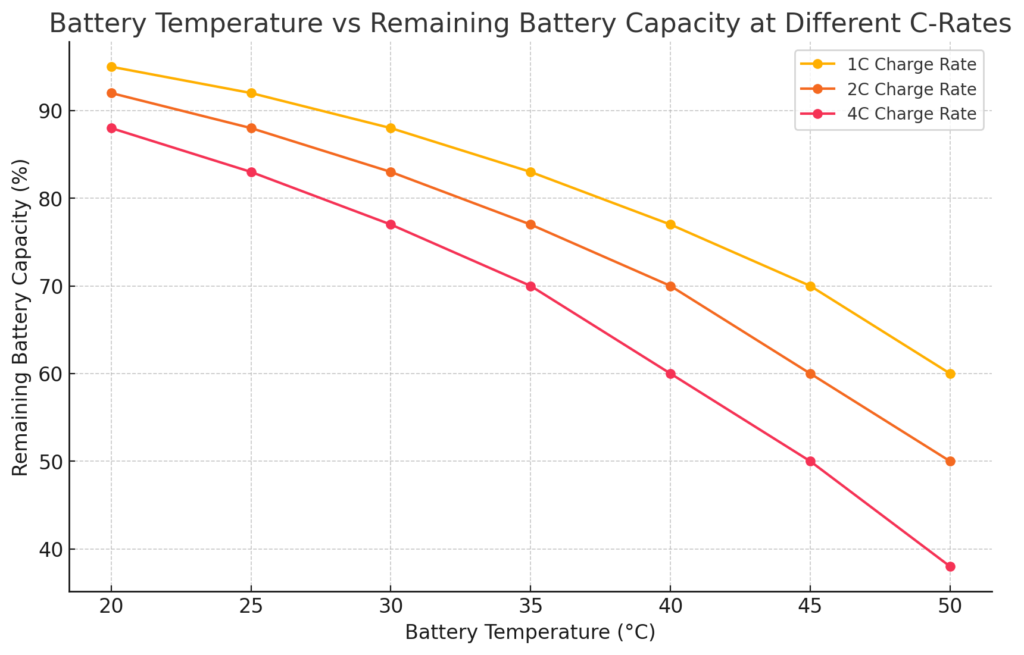 At a 1C charge rate, the degradation is moderate, but as the C-rate increases to 2C and 4C, the remaining capacity drops sharply. For example, at 4C, the capacity loss is significantly greater, particularly at higher temperatures. This highlights the importance of managing both charging speed and temperature to preserve battery health.